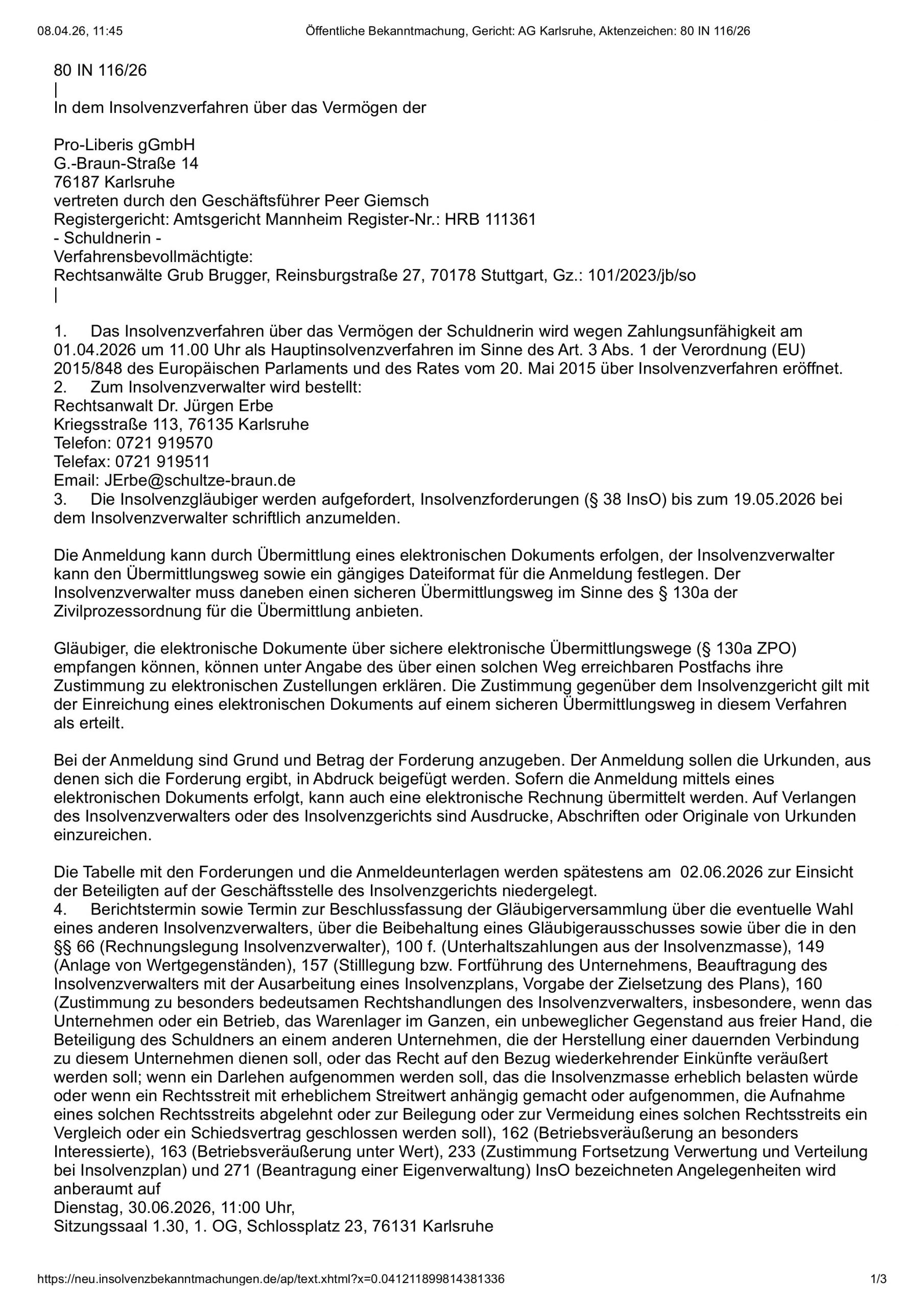 Das Insolvenzverfahren der Pro-Liberis gGmbH wurde nun gerichtlich eröffnet. Die öffentliche Bekanntmachung dazu finden Sie hier.